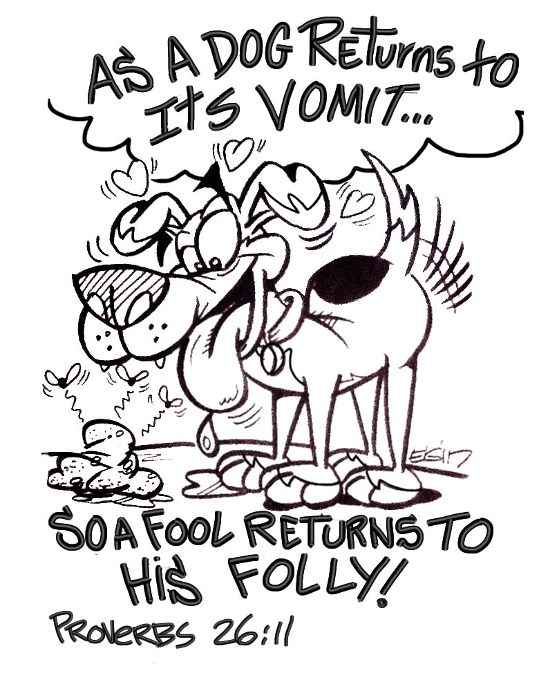 Here is another cartoon illustration related to April Fool’s Day from Elgin Bolling. This one is based on Proverbs 26:11 where it says, “As a dog returns to its vomit, so a fool returns to his folly.” The illustration might be too gross for some, but it’s a clear presentation of what the Bible actually says. Remember, this is God’s divine perspective on our sin & foolishness.