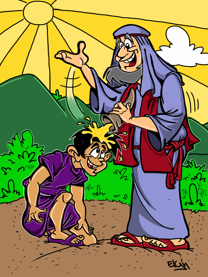 Use this free cartoon caricature style illustration and coloring page when teaching about how David became King of Israel. This printable download shows the Prophet Samuel pouring the anointing oil on young David’s head. This Bible story is found in 1 Samuel 16. Use our search page to find free lesson plans based on that same scripture passage.