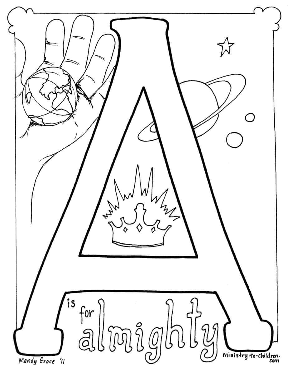 This is the first sheet in our free Bible Alphabet coloring pages for children. For each illustration in this project, we are letting our readers chose the concepts.