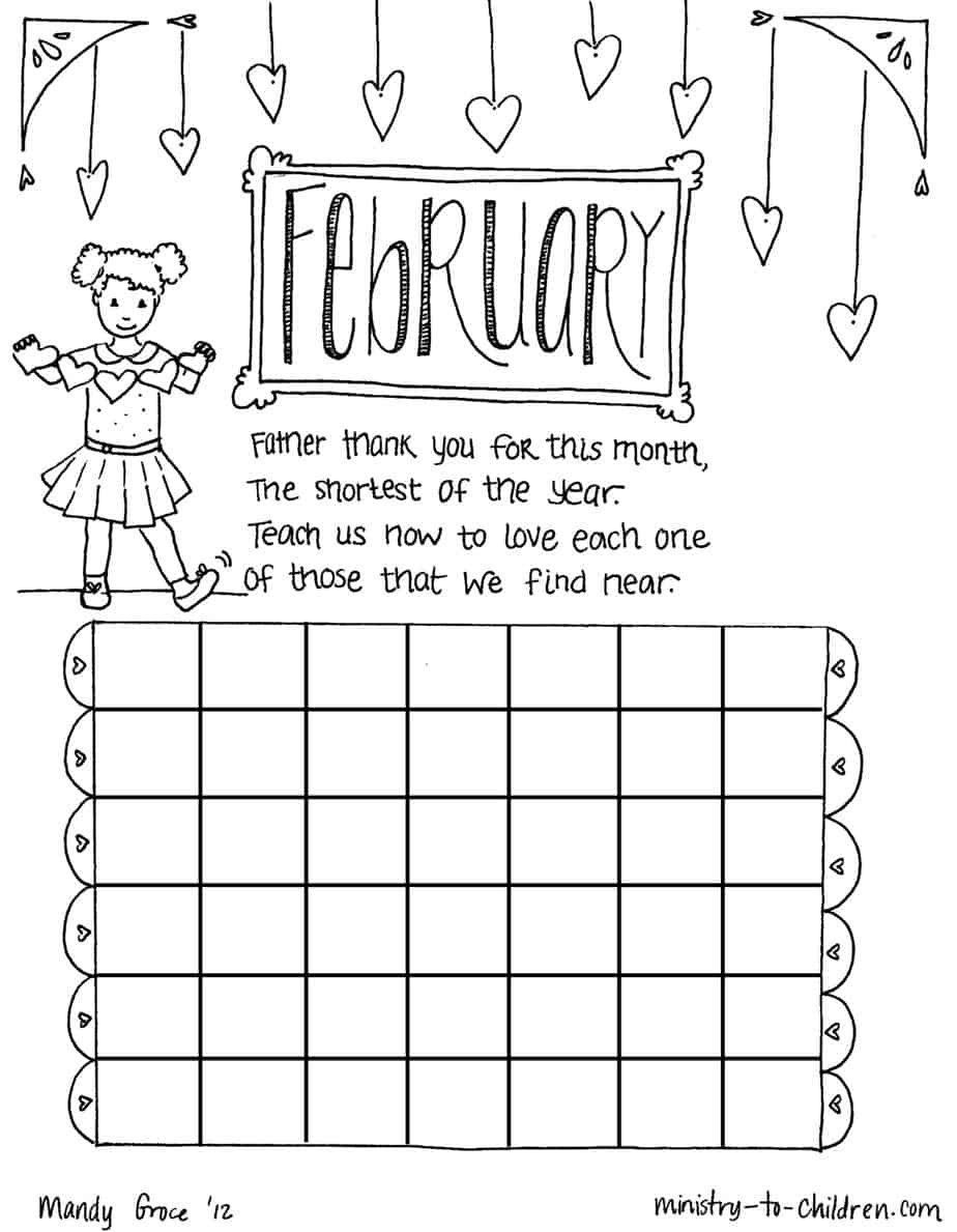 This free coloring page calendar for February will help children learn their months and number the days. Click here to see all the months in our calendar. The illustration shows a young girl with paper heart shapes and has the following peom: