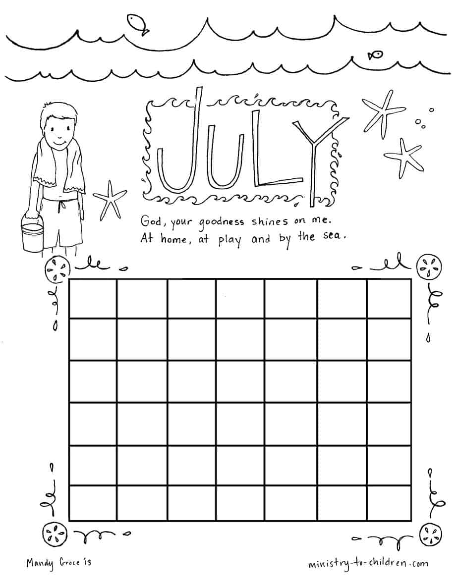 This free printable will help children number the days of July and celebrate its special place in God’s plan for the year. In North America, July is often the hottest month and children spend their time swimming, playing baseball, or vacationing with family. It’s also the month where we celebrate Independence Day. Click here to see all the months in our calendar.