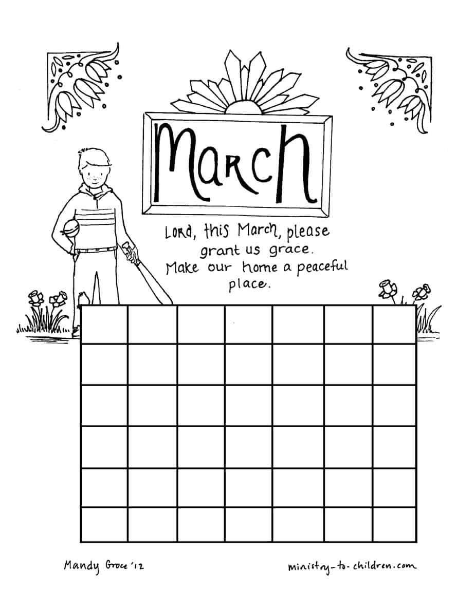 Mandy’s illustration and calendar sheet for March shows some familiar signs of early Spring. Click here to see all the months in our calendar. The tulips are blooming and the young boy is holding his baseball bat. The text reads: