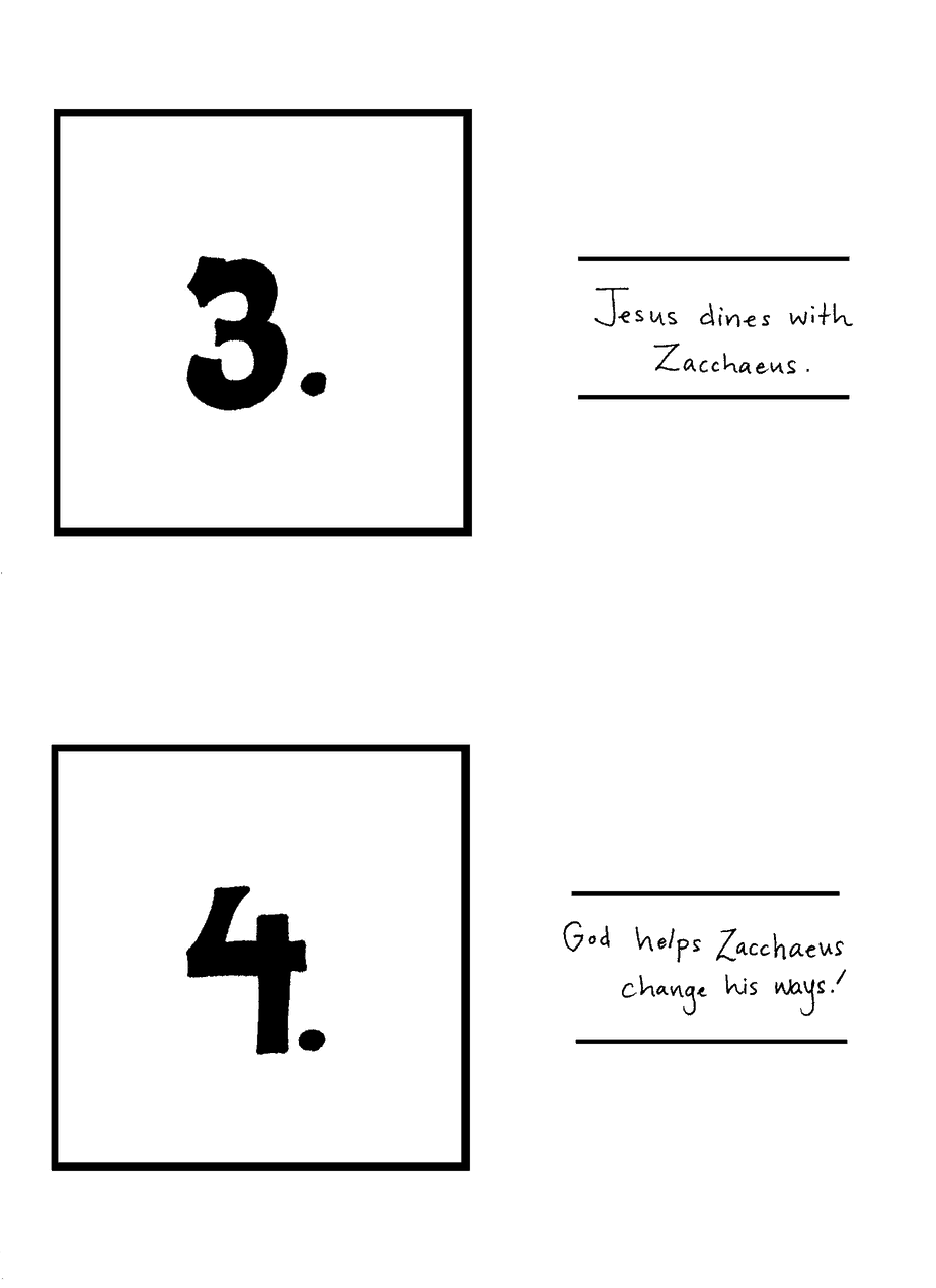 This free coloring page will help teach the story of Zacchaeus and Jesus from Luke 19:1-10. It has four panels that break the story into brief sequenced cards. Click on the preview image to the right or use the following links.